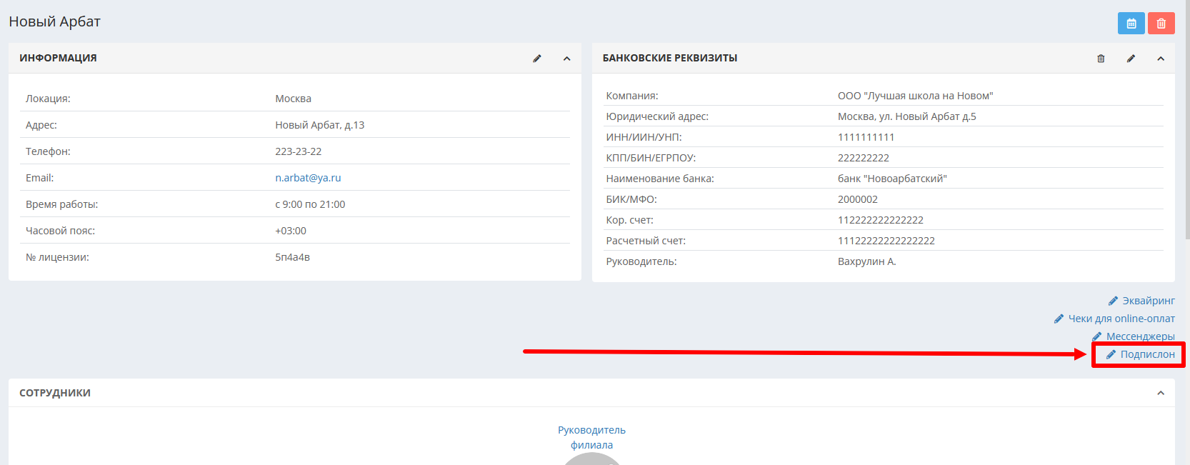 Если нужно прописать настройки у отдельного филиала, перейдите в раздел Компания - Филиалы, нажмите на название филиала и затем на ссылку "Подпислон": - Для проверки корректности введённых данных, а также чтобы увидеть остаток документов на балансе нажмите "Инфо":