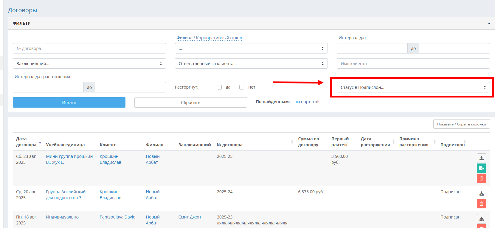 - Ученик подписывает договор, информация обо всех этапах подписания приходит в СРМ и может быть просмотрена в файлах ученика в колонке "Подпислон", а также в списках договоров и документов: