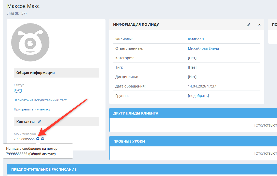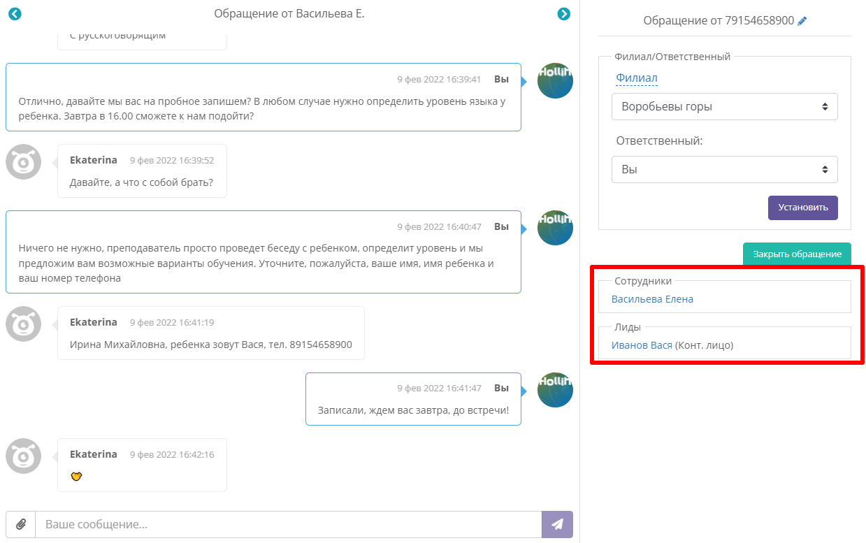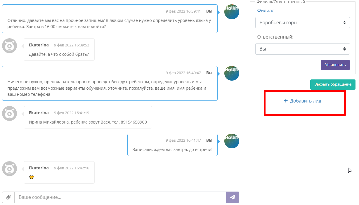При добавлении нового лида из окна чата номер телефона автоматически пропишется в карточку лида.