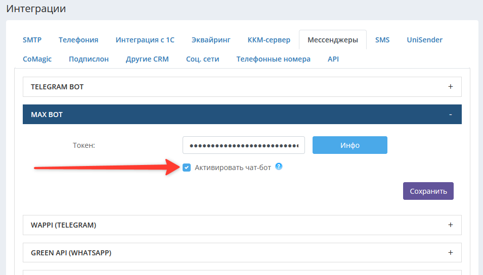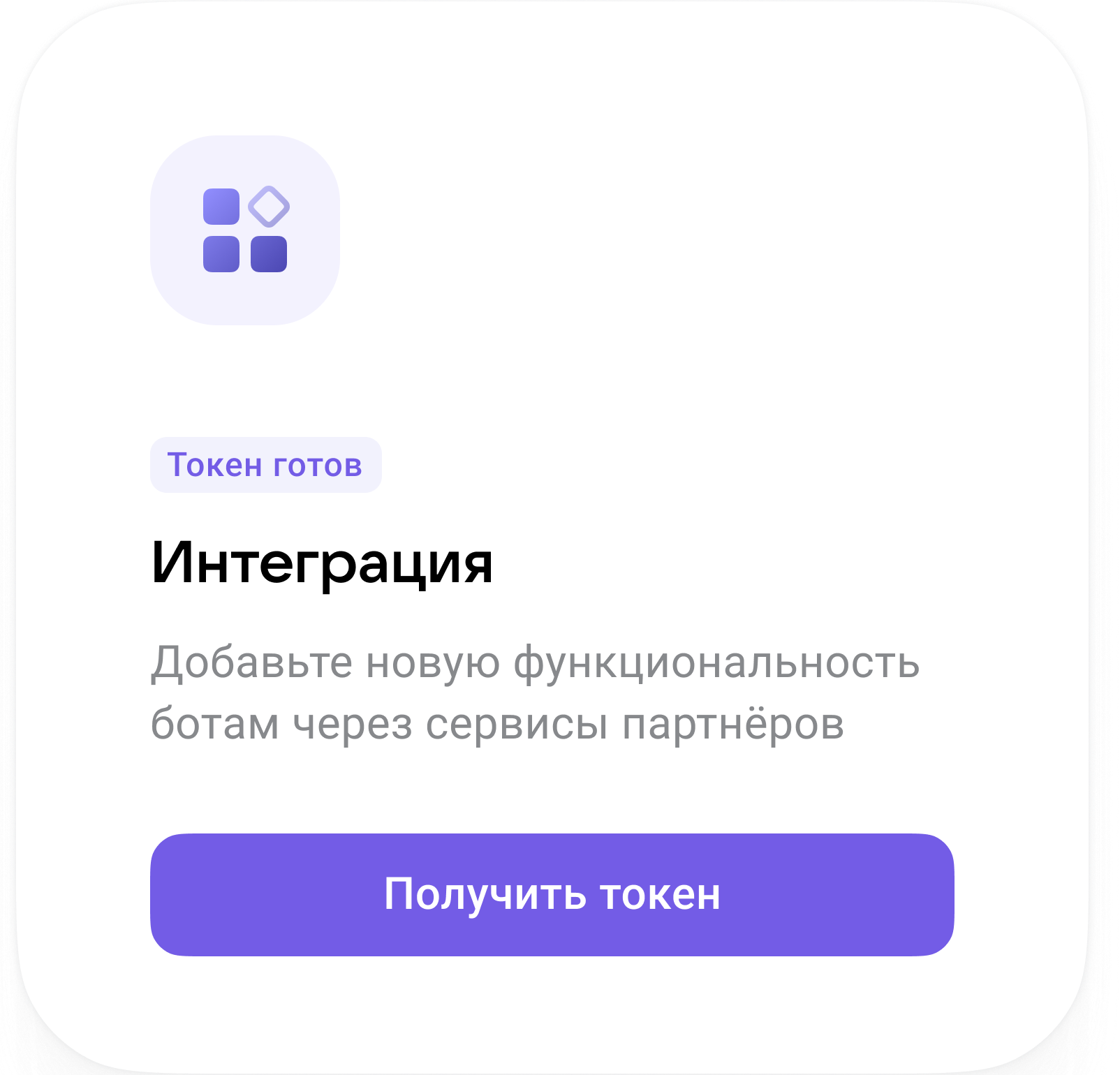 - После того, как чат-бот будет создан и успешно проверен, в вашем профиле Max в разделе Чат-боты → Интеграция → Получить токен появится токен, при помощи которого вы сможете подключить его к CRM.